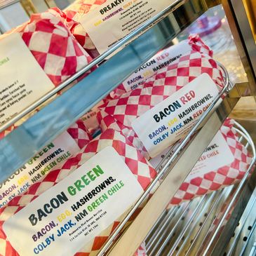 Thick Hardwood Smoked Bacon, Cheddar Cheese, New Mexican Red Chile or Chopped Green Chile